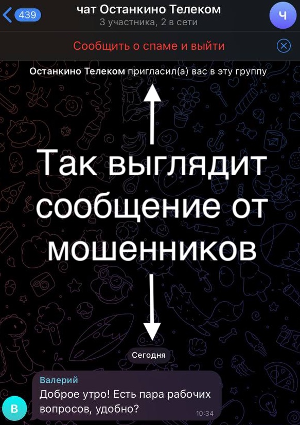 Заблокируйте сами мошеннический “чат Останкино Телеком” в Телеграм, не отвечайте ни на какие предложения и предупредите своих коллег об очередной вылазке мошенников.